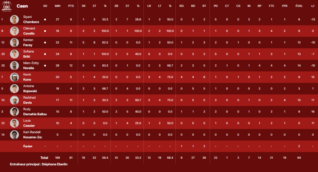 Radshad Davis et Marc-Eddy Norelia ont ensuite parfaitement œuvré pour que le CBC reste en tête (33-26, 15′). On se disait alors que la machine était parfaitement lancé. Mais quelques détails la grippait et Rouen finissait fort (35-41, 39′). Heureusement, Clément Cavallo et ses troupes s’accrochaient pour finir fort et rester au contact avant la mi-temps (39-41, 20′).