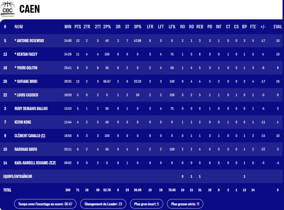 Dans le deuxième quart-temps, les deux équipes restaient au coude à coude. La balle circulait bien côté caennais à l’image de ce ballon ressorti pour Antoine Rojewski qui scorait à 3-points (21-26, 15′). Malheureusement derrière, les locaux enchaînaient avec un 18-3 qui faisait mal à la tête (39-29, 20′).