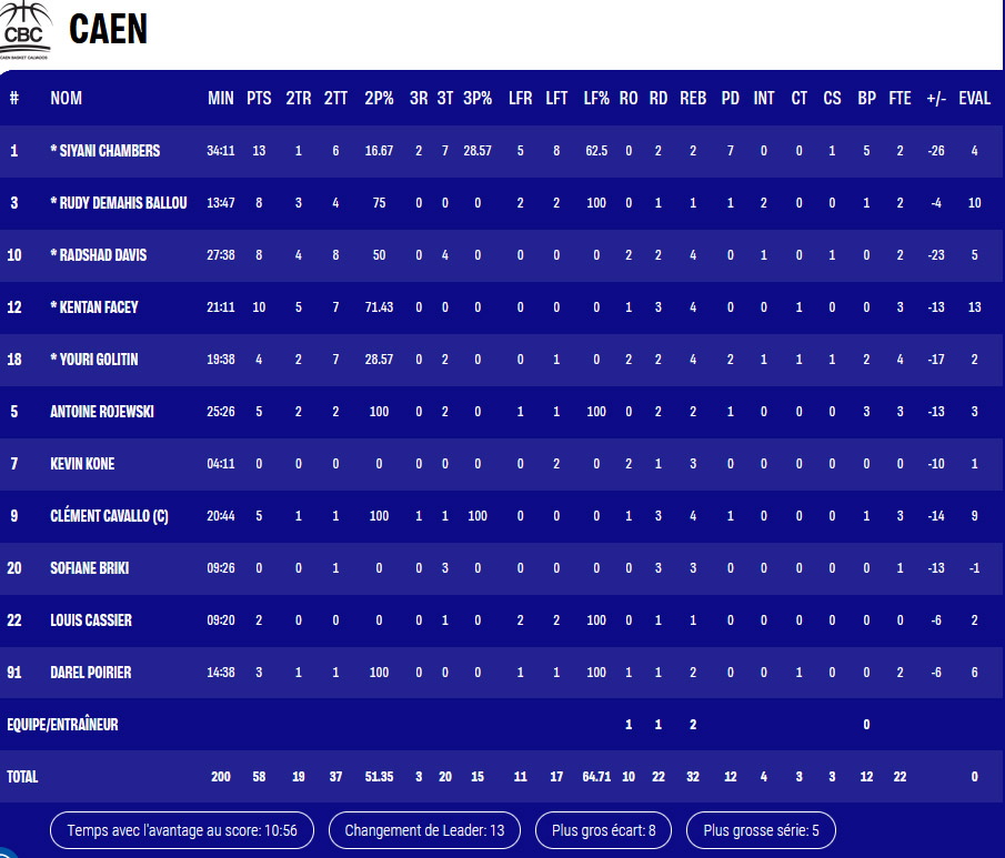Pour lancer la soirée dans le complexe de la porte du Hainaut à Denain, la paire Chambers-Facey faisait parfaitement l’affaire pour commencer (0-2, 1′). On retrouvait Siyani Chambers quelques instants plus tard, à la passe, pour Radshad Davis, puis Kentan Facey (8-10, 4′). Un 2+1 d’Antoine Rojewski nous mettait devant (10-15, 6′) et capt’aine Cavallo nous offrait un magnifique lay-up renversé sur une passe de Rudy Demahis-Ballou (14-21, 9′), avant un super drive du meneur caennais (15-23, 10′). Bref, tout roulait ou presque.
